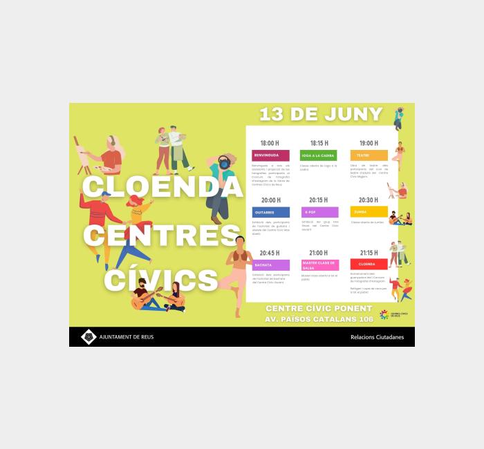 L'acte tindrà lloc el proper dijous 13 de juny a partir de les 18h al Centre Cívic Ponent (Av. Països Catalans,106) i estarà format per diferents activitats i actuacions procedents dels diferents centres i que representen una petita mostra del dia a dia en els Centres Cívics de Reus.